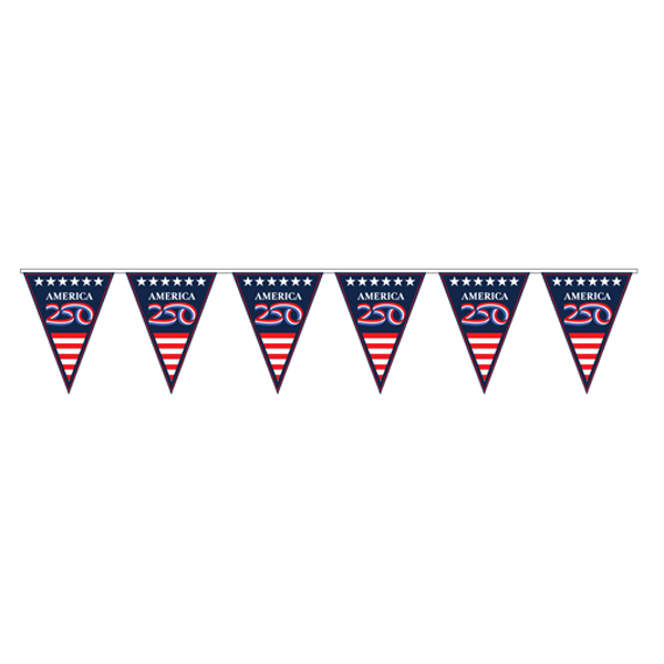 Each pennant string features digitally printed, double-sided V-shaped or Rectangle pennants produced using high-quality digital lithography for crisp detail and vibrant color. Lightweight and easy to install, these strings allow you to quickly transform large areas while maintaining a clean, professional presentation. Available in multiple lengths, America250™ Pennant Strings can be used on their own or layered with flags, banners, and pole displays for a cohesive commemorative look.