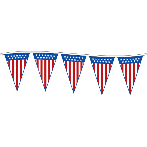 All weather-resistant 4 mil polyethylene pennants printed three colors on clear poly film and double sewn on plastic covered high strength, sag-resistant header.