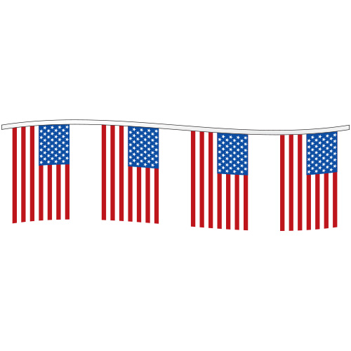 Our Poly Style American Flag Lines consist of 17" x 11" Flags on a string. Printed three colors on clear 4 mil premium embossed poly film. These Flag Lines are intended for short-term promotions.