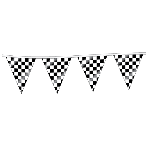 All deluxe checks are flexo-printed one side on clear 6 mil super-duty poly pennant film for double-sided visibility and double sewn on a plastic covered high strength sag-resistant header. Available in 3 different string lengths.